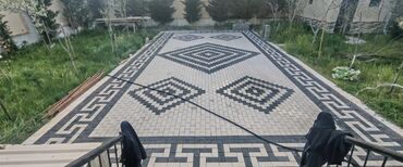 Şəkillərdə gördüyünüz dekorativ səki daşları (brusçatka) ilə həndəsi naxışlı landşaft örtüklərinin hazırlanması xidməti.