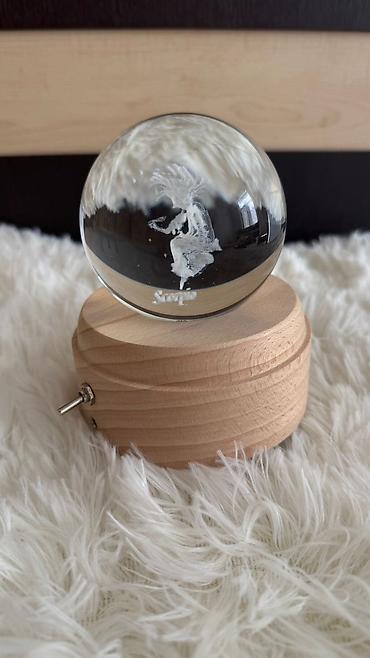 - Sağ modell: Şəffaf kristal kürə taxta dayağın üzərində. Kürənin daxilində 3D lazer oymalı fiqur (peri/qız silueti) var. Aşağıda mexaniki açar tipli keçid mövcuddur; taxta baza sayəsində skandinaviya/eko üslubunda görünüş yaradır. Gecə lampası effekti üçün işıqlandırma ilə uyğun istifadəyə nəzərdə tutula bilər (işıq mənbəyi şəkillərdə göstərilən baza üzərində yerləşir).