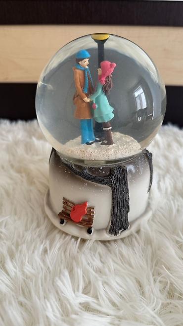 - Sol modell: Qış mənzərəli qar kürəsi. İçəridə skamyə və fənərin yanında əl-ələ tutmuş cütlük fiqurları, alt hissədə ağ-çəhrayı tonlarda landşaft və ağac relyefi olan bəzək. Silkələndikdə “qar” effektli hissəciklər hərəkət edir. Masaüstü dekor, romantik atmosfer üçün idealdır.
