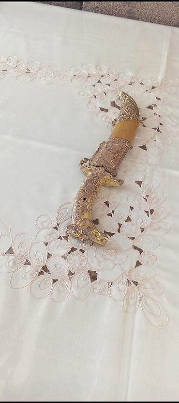 Qabzalı və qınlı dekorativ xanjar - Əl işçiliyi ilə bəzədilmiş, Şərq motivli metal qın və dəstək. Qara fon üzərində incə oyma naxışlar, qızılı və gümüşü rəngli tətbiqlər, qında qırmızı bəzək daşı....