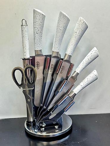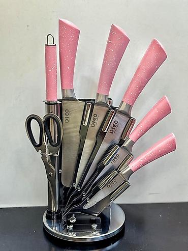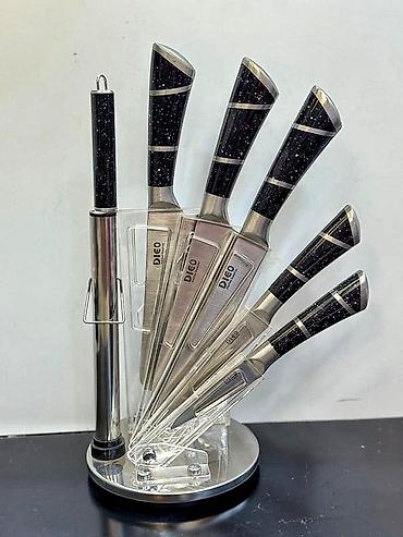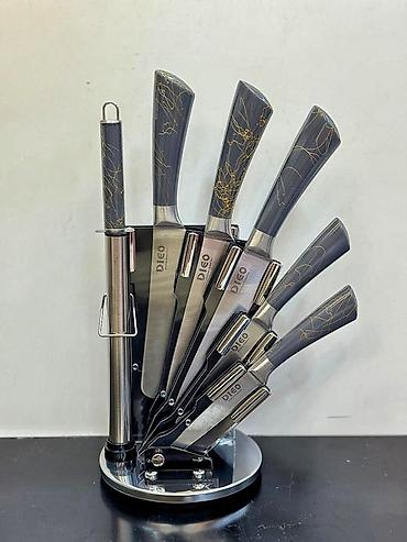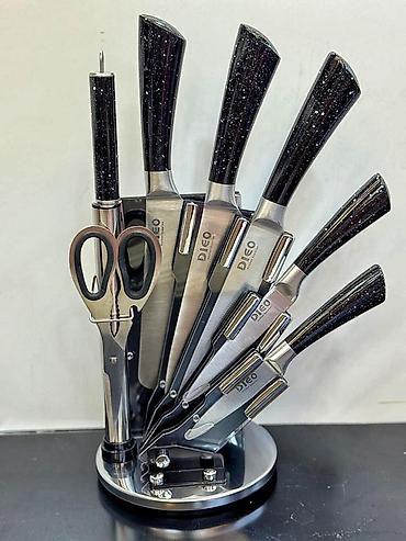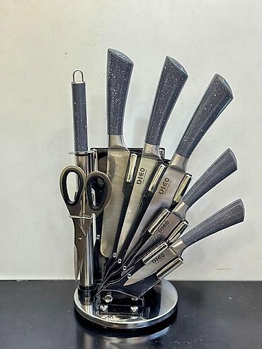 - Komplekt: 5 bıçaq, itiləmə çubuğu, mətbəx qayçısı, fırlanan metal stend