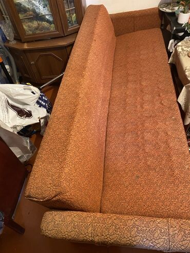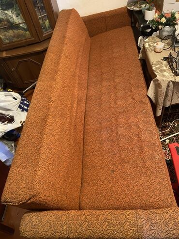 - Divan: 3 nəfərlik, yumşaq oturacaqlı. Qollu, yüksək arxalı konstruksiya. Parça üzlük narıncı-qırmızı tonlarda, xırda naxışlı dizaynla. Oturacaq və bel hissələri iri yastıq forması ilə rahat dəstək verir. Klassik xətlər, taxta karkas. Qonaq otağına və ya geniş koridora uyğun ölçü.