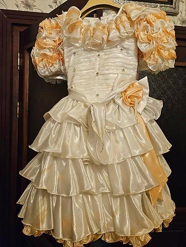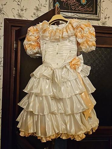 Zərif uşaq qız paltarı təzə - Rəng: krem/bej tonlarında - Naqış: incə barokko üslubunda relifli desen - Dizayn: qısa qollu, çiyinlərdə büzgülü volanlar - Ön hissədə dekorativ atlas bant və kiçik m...
