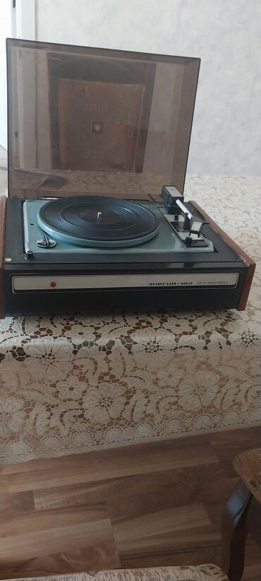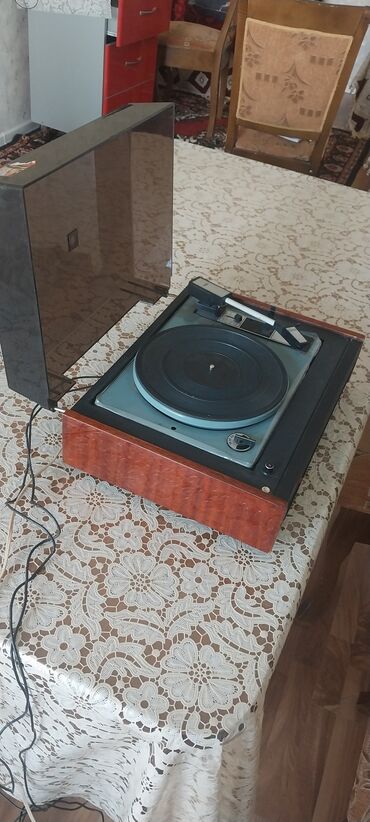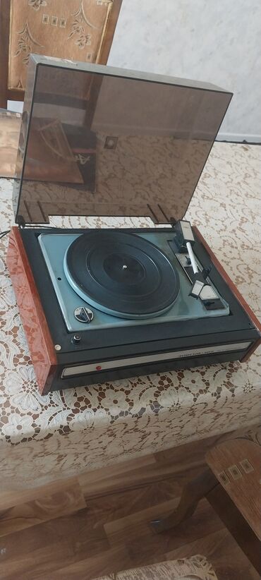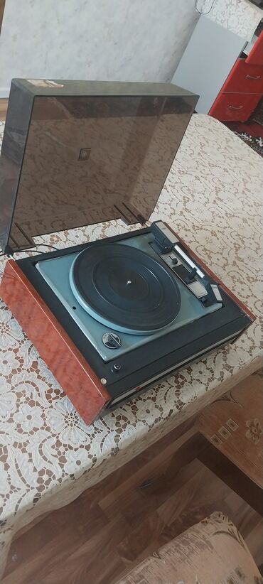 Retro kolleksiya və vinil dinləmək üçün klassik sovet dövrü pikap. Model adı və dizaynı şəkillərdə açıq görünür.