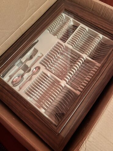 Almaniyadan alınıb.Brend mağazadan.Təmiz polad.1qutuda 1çay qaşığı q xörək qaşığı 1 çəngəl 1 bıcaq var.Arxa tərəfində zavodun möhürü var.30 avroya alınıb