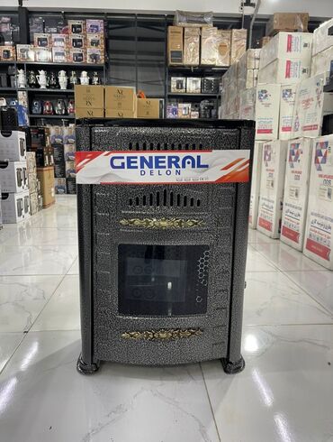 General Delon qaz sobası – dekorativ metal korpus və şüşə ön panel ilə klassik dizayn.