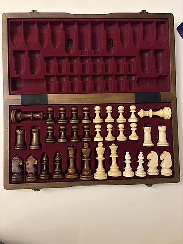 - Fiqurlar: İki rəng taxta fiqur komplekti (ağ və qəhvəyi). Aşağı hissələri yaşıl filt örtüklüdür – lövhədə hamar hərəkət və səsin azalması üçün.