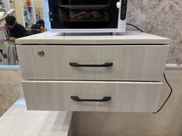 - Asma tualet masası modulu: açılıb-bağlanan 2 geniş çekmece, qara tutacaqlar; yuxarı səthdə cihaz və aksesuarlar üçün yer. Üst çekmecədə kilid var.