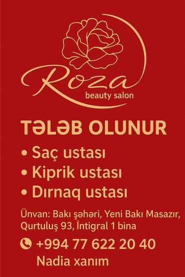 Vakansiya: Gözəllik salonuna usta axtarılır - Saç ustası (universal): peşəkar, təcrübəli, hər işi bacaran xanım usta - Dırnaq ustası: dırnağa aid bütün prosedurları bilən, səliqə və gigiyenaya müt...