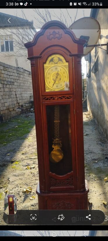 Klassik üslubda böyük pednulyar (floor) saat. - Korpus: qəhvəyi rəngli, oyma naxışlı taxta korpus, yuxarı hissəsi tağ formalı başlıqla. - Siferblat: qızılı rəngdə dekorativ naxışlar, ərəb rəqəmlər...