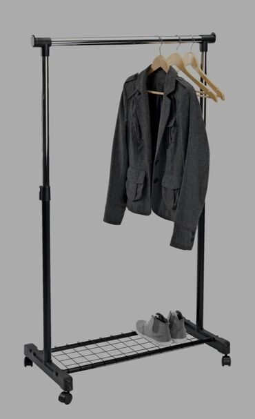 Geyim asqısı üçün təkərli mobil askı stendi - Material: paslanmayan metal boru (üst ştanq), möhkəm plastik birləşmələr - Təkərlər: 4 ədəd, rahat hərəkət üçün - Alt hissə: şəbəkəli rəf – ayaqqabı, ...