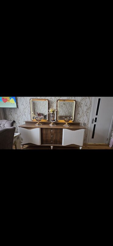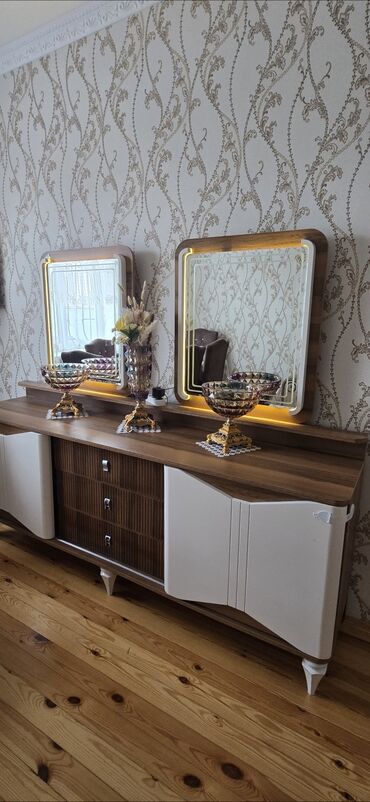 Klassik üslubda dekorativ güzgülü bufet/konsol dəsti. - Ön hissədə iri ölçülü güzgü paneli, tağvari dekor xətti və qızılı rəngdə ornamentlər - Aşağı hissə: 4 qapılı şkaf bölməsi; hamar krem rəngli...
