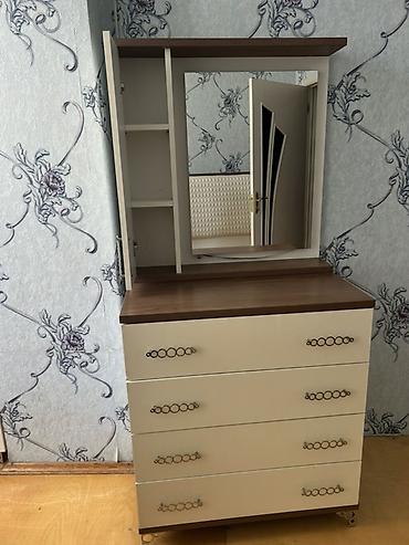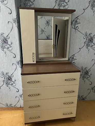 Tek mebel güzgülü şkafdır ideal veziyyetdedir xaçmaz rayonundadır Güzgülü komod - Material: ağac teksturalı laminat, ön hissədə dekorativ qızılı naxış elementləri - Üst hissədə iri oval güzgü (çə...