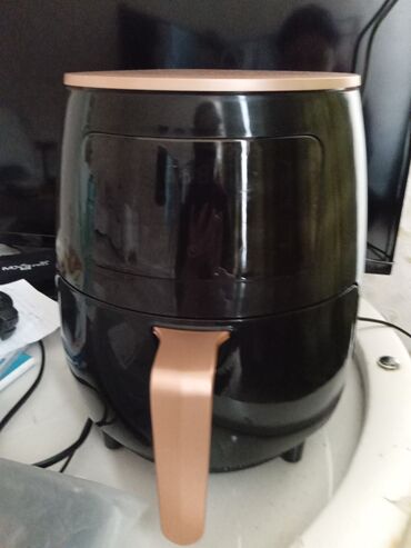 Hava fritteri (air fryer) – qara gövdə və tunc/qızılı rəngli sap və üst hissə ilə. Xüsusiyyətlər: - Sürüşdürülən səbət tipli quruluş - Elektrikli, isti hava ilə qızartma/bişirmə - Ön paneldə toxun...