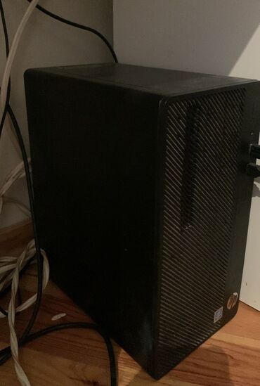 - Sistem bloku: HP kiçik qüllə korpusu, ön paneldə şaquli havalandırma barmaqlığı, Intel prosessor nişanı görünür, yanlarda çoxsaylı USB portları və audio qoşulma yerləri.