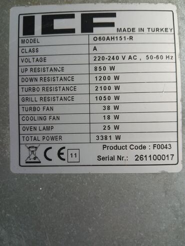 ICF quraşdırılan elektrik sobası (model: O60AH151-R) - Enerji sinfi: A - Gərginlik: 220–240 V AC, 50–60 Hz - Ümumi güc: 3381 W Isidici elementlər: - Yuxarı rezistor: 850 W - Aşağı rezistor: 1200 ...