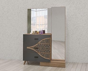 - Komod-güzgü bloku: 3 geniş çekmecəli komod (tünd boz cəbhə, taxta dekorlu naxış keçidi), yanında tam boy güzgü paneli taxta bazalı.