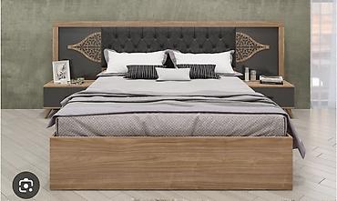 - İki nəfərlik çarpayı: taxta teksturalı karkas, yumşaq kapitone başlıq (tünd boz), başlıq panelində dekorativ naxış elementləri; geniş taxta ön panel. Hər iki tərəfdə inteqrə edilmiş tumbalar (açıq səth, tünd boz çekmece), üzərində kitab/aksessuar üçün yer.