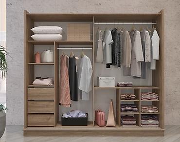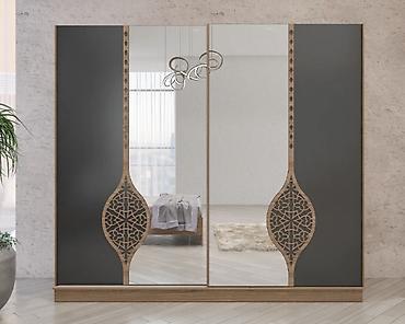 - Paltar şkafı: sürüşkən qapılar, bir qapı tam güzgülü, digərində taxta üzərində şərqli naxış aplikasiyası. Daxili quruluş: 2 asılqan zonası (uzun və qısa geyim üçün), yuxarı geniş rəf, solda 3 çekmece və əlavə rəflər, sağda çoxlu kvadrat bölmələr qatlanmış geyim və aksessuarlar üçün, aşağıda çanta/səbət sahəsi.