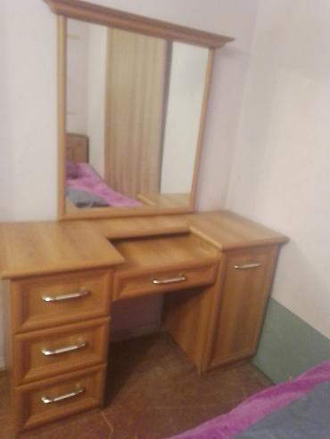 - Tualet masası güzgü ilə: solda 3 çekmece, ortada sürüşən kiçik çekmece, sağda qapalı şkaf bölməsi. Geniş masaüstü və iri çərçivəli güzgü gündəlik istifadə üçün rahatdır.