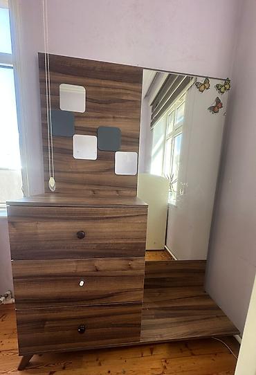 - Tualet masası: geniş masaüstü, yan hissədə tam boy güzgü paneli və kiçik dekorativ güzgülər, aşağıda 3 iri çəkməcə, yanında oturmaq üçün taxta platforma