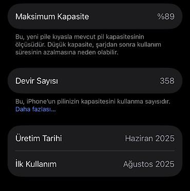 Apple iPhone (USB‑C girişli model) - Ekran: tam ön panel, Dynamic Island kəsiyi ilə. Parlaq və rəng dəqiqliyi yüksək ekran. - Batareya: Pil Sağlamlığı bölməsində Maksimum Kapasite 100% göstərilir....