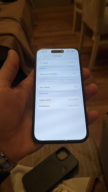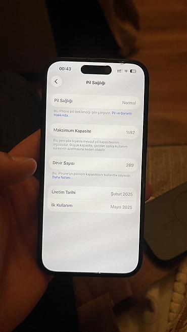 Apple iPhone 15 plus(qara rəng). Ekranda “Pil Sağlığı” bölməsindən məlumatlar göstərilib: - Pil sağlamlığı: Normal - Maksimum kapasite: 99% - Devir sayı (cycle count): 166 - Pilin istehsal tarixi:...
