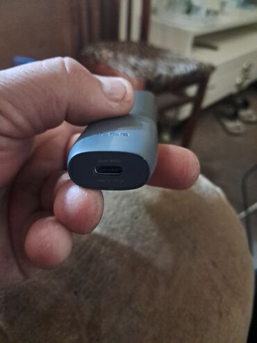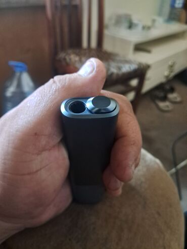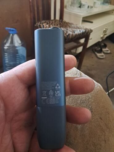 IQOS cihazı – tünd boz rəng, kompaktdır. Üst hissədə açılan başlıq və söndürmə/başlatma düyməsi var. Arxa tərəfdə istehsal nişanları və təhlükəsizlik işarələri qeyd olunub. Alt hissədə USB‑C girişi ilə şarj olunur (Model: M2703, giriş: 5V⎓2A yazısı görünür). Korpus oval formadadır, ovuca rahat oturur. Elektron tütün heat-not-burn istifadə üçün nəzərdə tutulmuş tutacaq/holder tipli cihazdır. Portativ, gündəlik daşımağa uyğun.