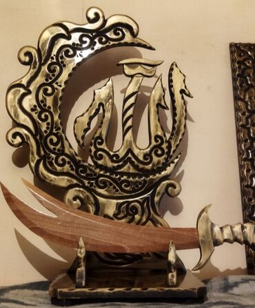 3) Stolüstü dekor – qızılı-qara ornamentli “Allah” kalliqrafiyası və ön hissədə taxta teksturalı qılınc. Altlıq üzərində sərgilənir.