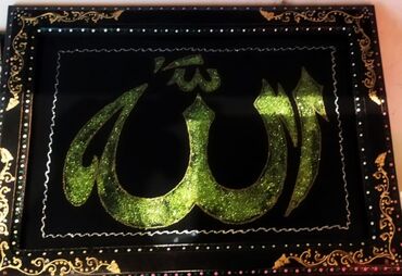 1) Şüşə/akril əsaslı, qara fonlu çərçivəli tablo – kənarları qızılı naxışlar, iç hissədə parıltılı (glitter) kalliqrafiya. Rənglər: yaşıl və çəhrayı variantlar.