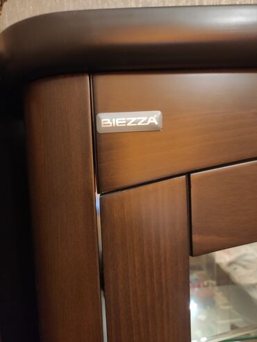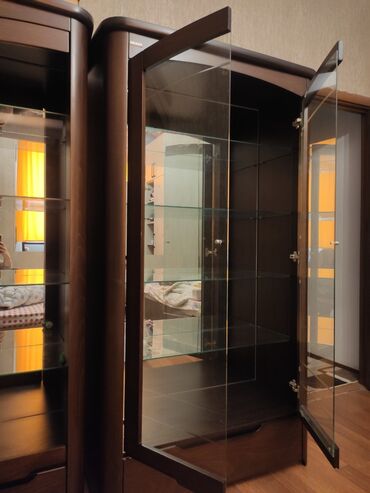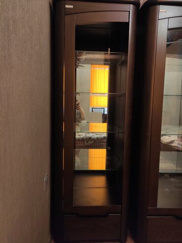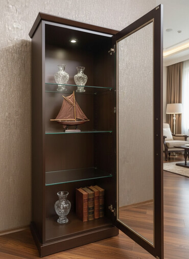 - Material: tünd qəhvəyi aĝac korpus, ön hissə tam şüşə qapı