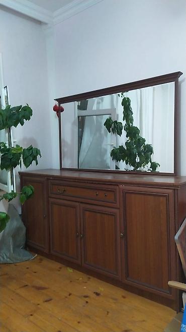 - Güzgülü bufet/konsol – klassik üslub. Üst hissədə iri güzgü, alt hissədə 4 qapılı şkaf və 2 çekmece. Taxta korpus, tünd qəhvəyi rəng.
