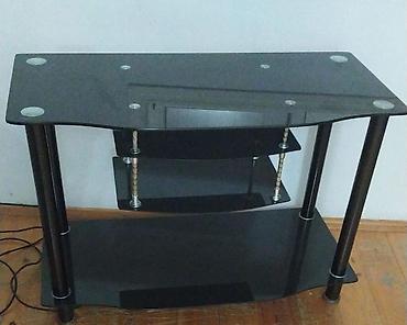 - TV stendi – şüşə və metal kombinasiyası. Üstü bərk temperli şüşə, 2 orta rəf və alt geniş rəf; naqillər üçün açıq konstruksiya. Qara rəng.