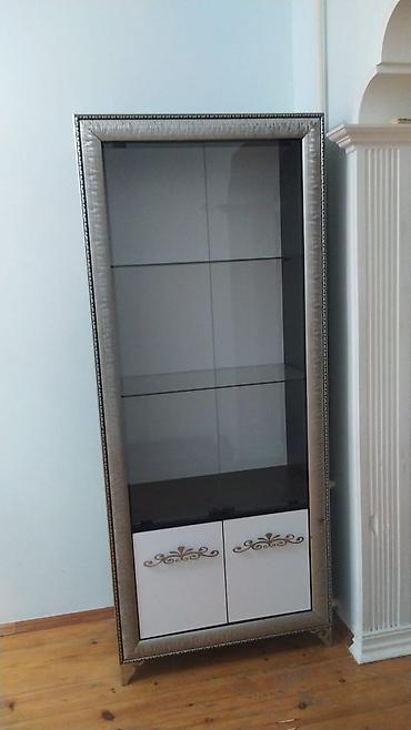 - Vitrin şkafı – önü şüşəli, içəridə 2 şüşə rəf. Alt hissədə 2 qapılı dolab. Çərçivədə dekorativ işləmələr, aşağı hissə ağ rəngli qapılar üzərində qızılı naxışlar.