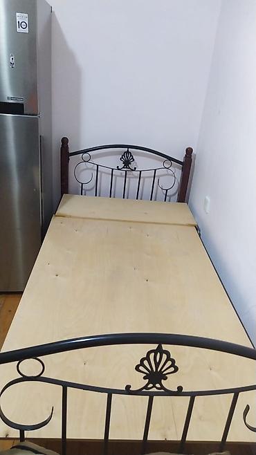 - Dəmir çarpayı – döşəksiz. Qara rəngli, metal karkaslı, başlıq və ayaq ucunda dekorativ naxışlı. Taxta lövhəli əsaslıqla. İki nəfərlik ölçüdə (təxmini 140–160 sm en).