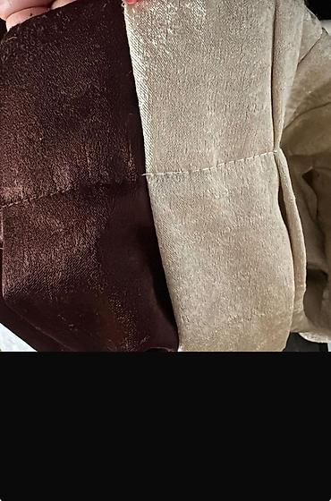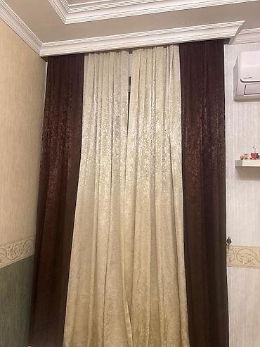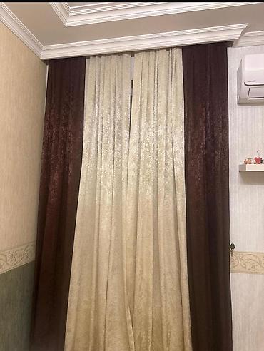 - Komplekt: 3 panel (2 tünd qəhvəyi, 1 krem) – yuxarı hissədə pərdə lenti tikilib, karnizə asmağa hazırdır.