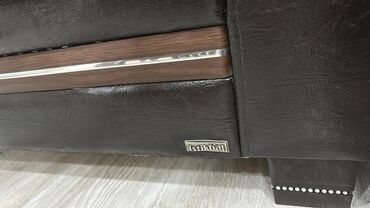 - Material və dizayn: tünd qəhvəyi eko‑dəri/deri görünümlü üzlük və taxta effektli dekor detallar; oturacaq və arxa hissədə bej rəngli parça yastıqlar; arxa yastıqlarda qara‑bej çiçək naxışı