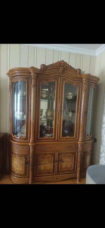 Mebel divar sistemi – klassik üslubda, qoz rəngində Xüsusiyyətlər: - Modul quruluş: bir neçə şkaf və vitrin bölmələrindən ibarətdir, birlikdə estetik vahid kompozisiya yaradır - Mərkəzdə şüşə qapı...