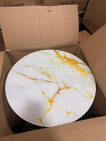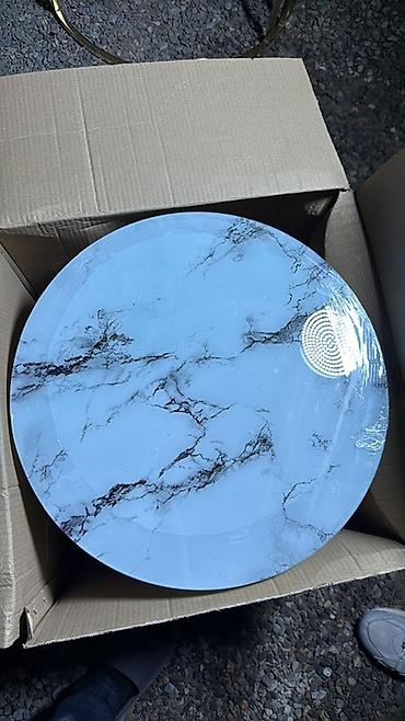 Mərmər naxışlı üstə malik, müasir dizaynlı orta stol. - Ölçü: 90x60 sm - Rəng: açıq krem korpus, mərmər effekti olan ağ üst səth - Korpusda iki tərəfli açıq rəf bölməsi – jurnallar, pultlar və akse...