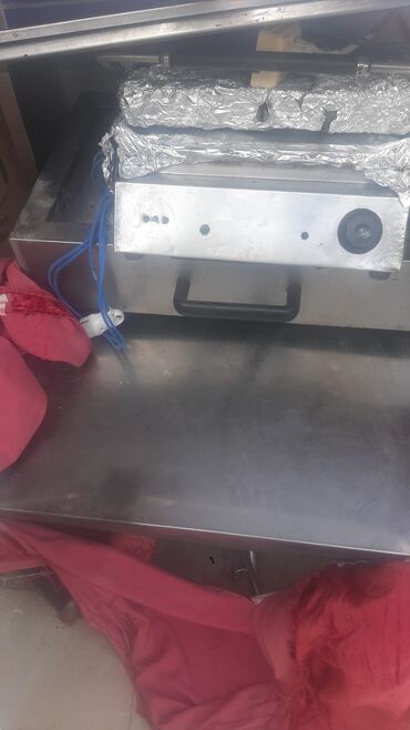 - Elektrikli kontakt qril/sandviç presi: ön paneldə idarəetmə düymələri yeri, izolyasiya üçün folqa örtüyü, istilik plitələri və daşıma/dartma tutacağı.