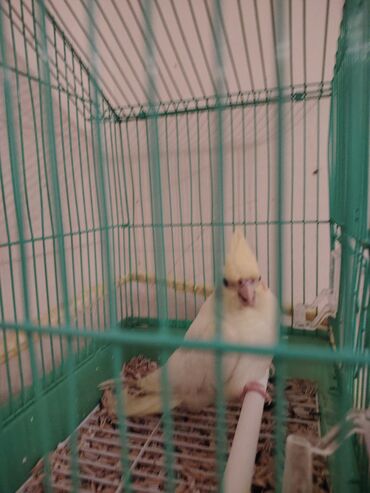 Nymph paraket (cockatiel) – quş qəfəsi ilə - Növ: Nymph paraket (cockatiel) - Rəng: sarı-yaşıl tonlarda, yanaqlarda narıncı ləkələr, başda uzun kakus (toqqa) - Qəfəs: metal korpuslu, alt hissəsi q...