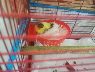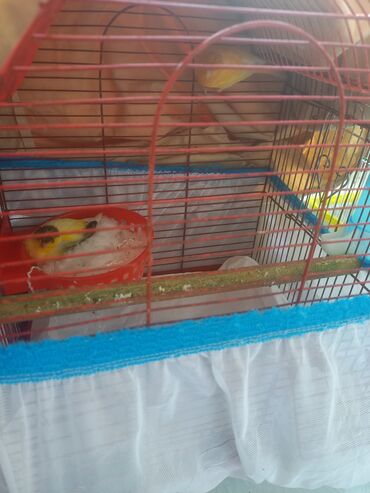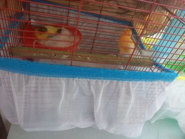 - Qəfəsin içində qırmızı plastik yuva səbəti, pambıqla doldurulub.