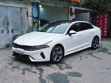 Kia K5 sedan – ağ rəng, fastback silueti və panoramik şüşə dam.