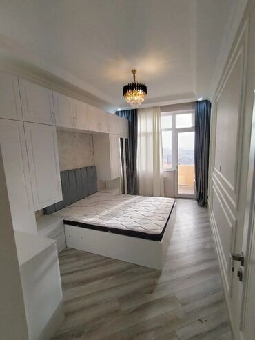 - Yataq otağı: geniş ikinəfərlik çarpayı, başlıqla inteqrə edilmiş quraşdırılmış dolab sistemi, komod və balkona çıxış; pəncərədən gün işığı bol düşür.
