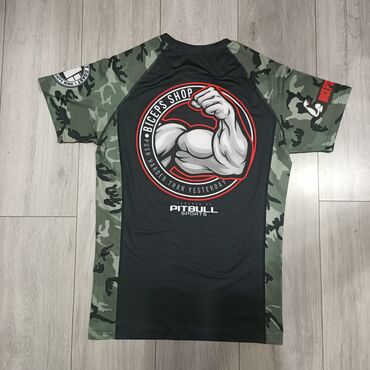 - Brend nişanları: Qollarda və arxada PitBull Sports və Biceps Shop loqotipləri