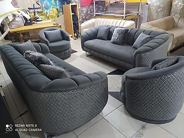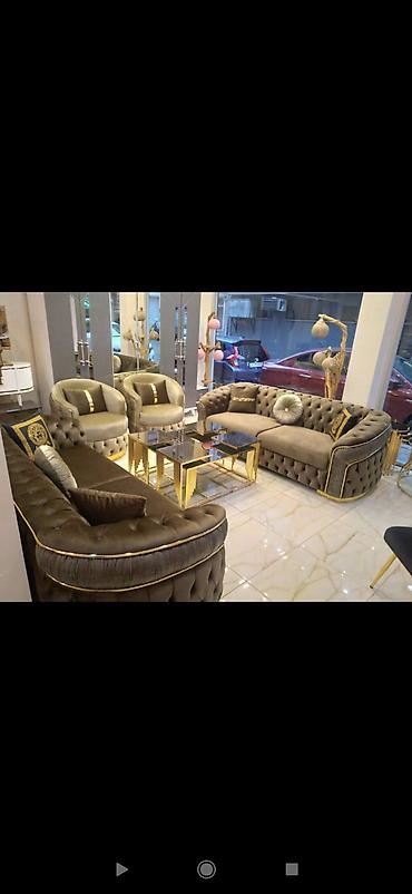 - Model: Premium salon dəsti – yumru xətli, dərin kapitone tikişli divan və kreslolar