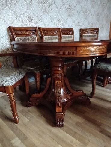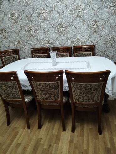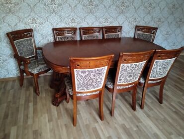 - Dəst: oval massiv ağac masa + 8 ədəd stul (onlardan 2-si qoltuqlu baş stul).
