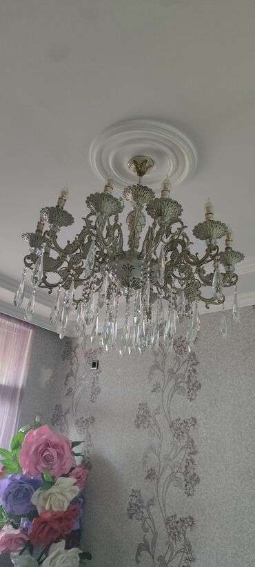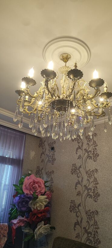 Kristal çilçıraq – klassik üslub çexya istehsalı 12 şamlı təzədi Qiyməti 250 azn . - Material: şəffaf kristal asqılar, şüşə qollar, metal (qızılı ton) mərkəz və asma hissə - Dizayn: çoxqollu kl...