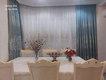 - Xarici qat: sıx toxunuşlu, zümrüd-mavi tonlarında dekorativ naxışlı qalın pərdə. Qızılı ornamentlər və medalyon motivləri ilə interyerə klassik zəriflik qatır, işığı yaxşı kəsir.
