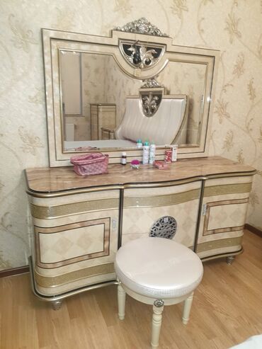 - Tuvalet masası böyük güzgü ilə (böyük iş səthi, yan şkaf qapıları, oyma dekor), dairəvi yumşaq taburet